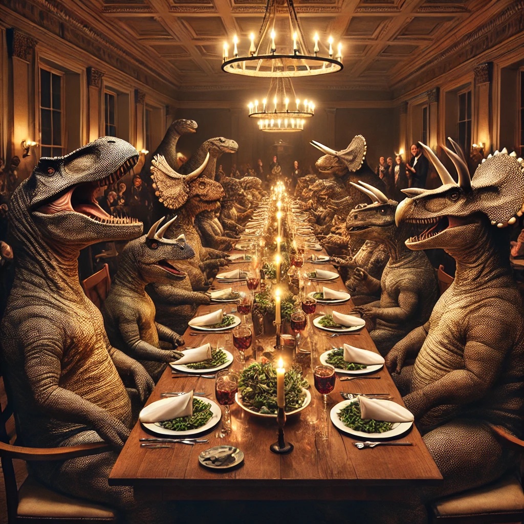 Představ si DINOSAURY, kteří se každý večer sejdou k VEČEŘI (dinner). Všichni dinosauři sedí u stolu, mají obrovské talíře a užívají si společnou DINNER → VEČEŘI.