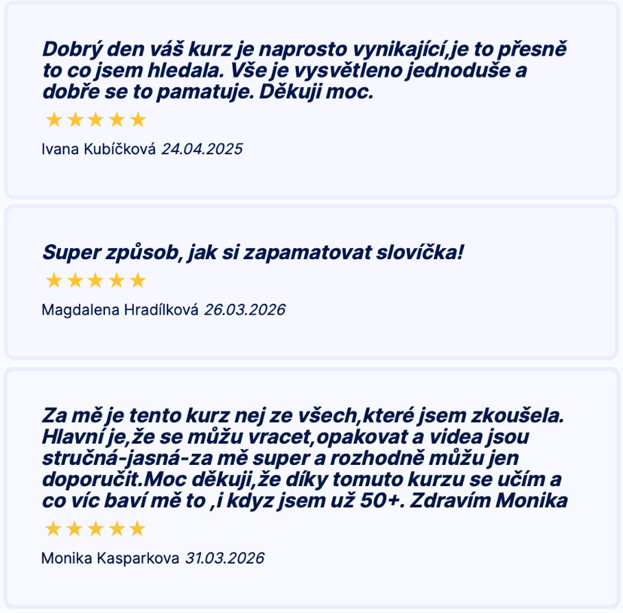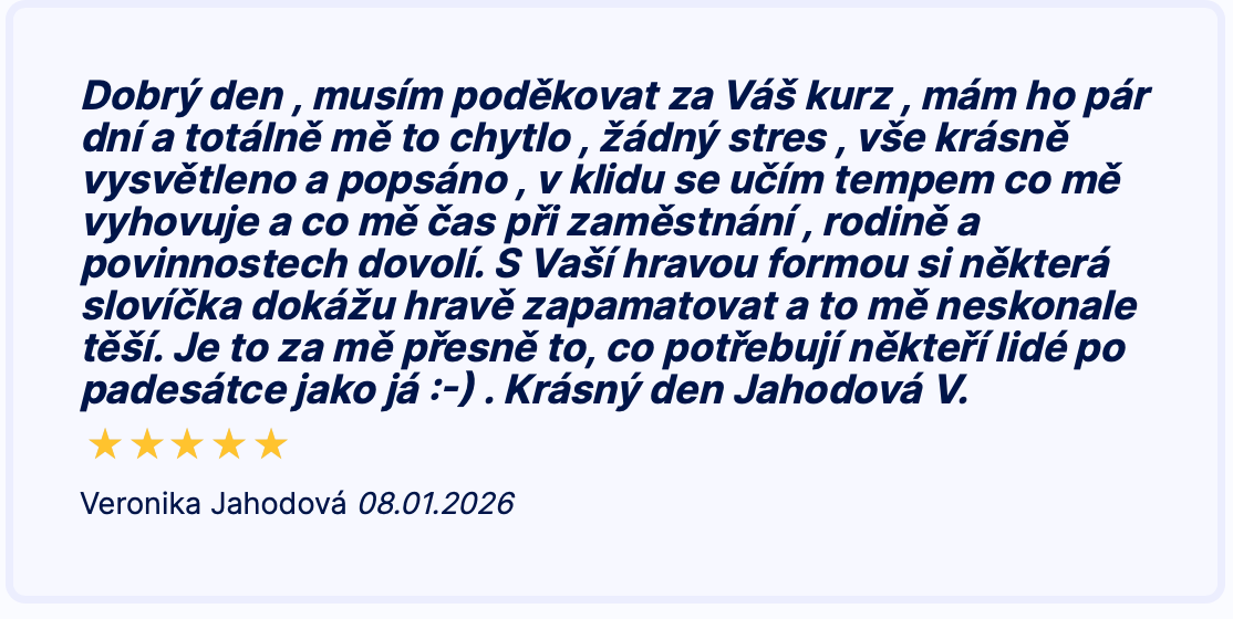 Dobrý den , musím poděkovat za Váš kurz , mám ho pár dní a totálně mě to chytlo , žádný stres , vše krásně vysvětleno a popsáno , v klidu se učím tempem co mě vyhovuje a co mě čas při zaměstnání , rodině a povinnostech dovolí. S Vaší hravou formou si některá slovíčka dokážu hravě zapamatovat a to mě neskonale těší. Je to za mě přesně to, co potřebují někteří lidé po padesátce jako já :-) . Krásný den Jahodová V.