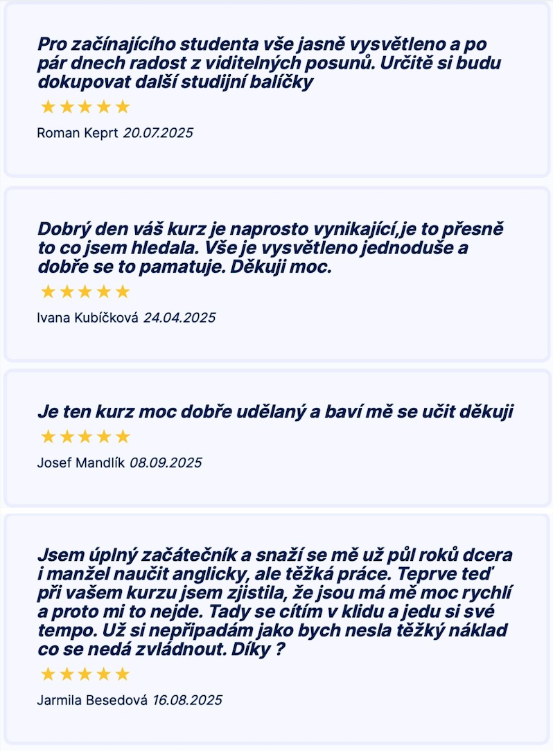 Jsem úplný začátečník a snaží se mě už půl roků dcera i manžel naučit anglicky, ale těžká práce. Teprve teď při vašem kurzu jsem zjistila, že jsou má mě moc rychlí a proto mi to nejde. Tady se cítím v klidu a jedu si své tempo. Už si nepřipadám jako bych nesla těžký náklad co se nedá zvládnout. Díky ?